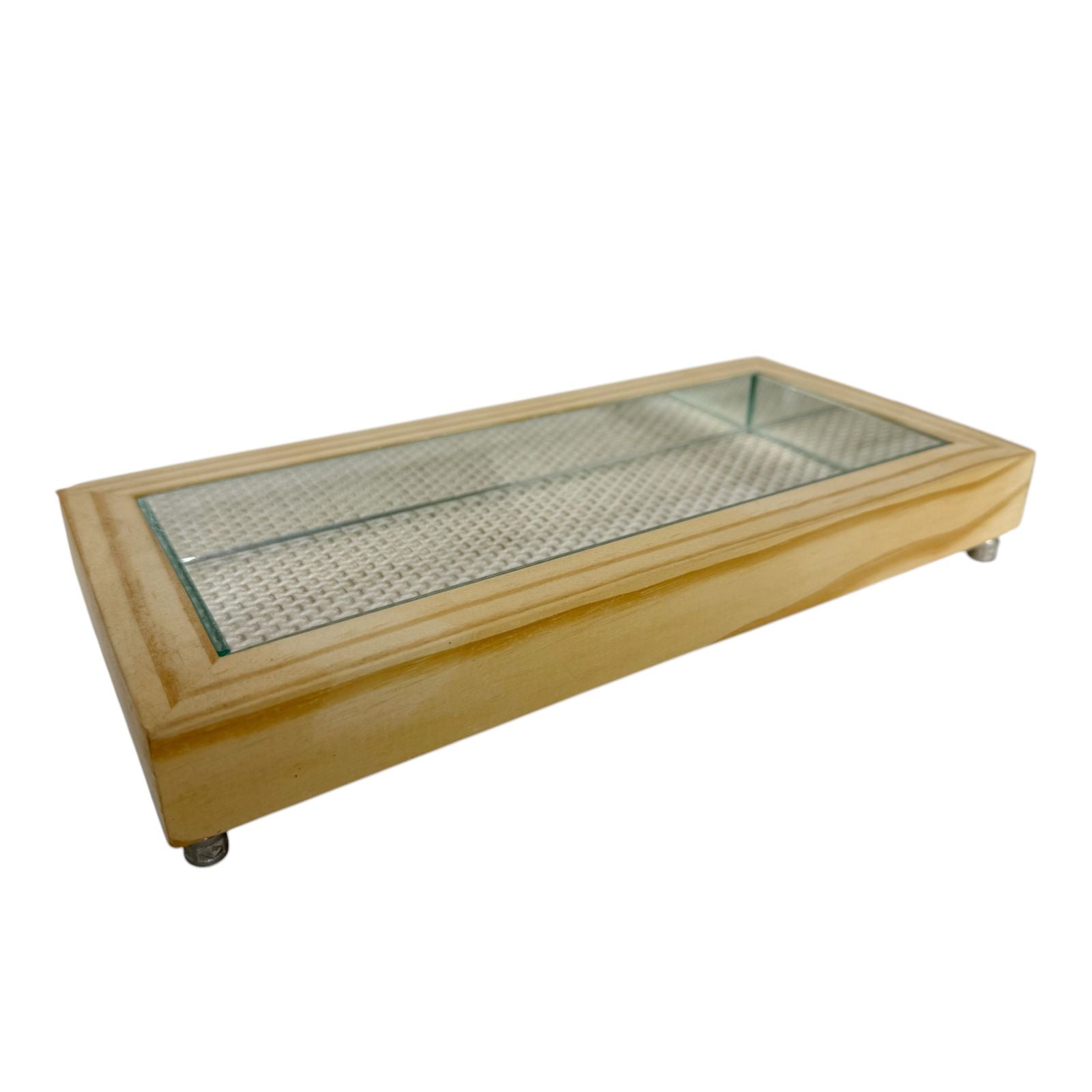 A Bandeja Trancoso é feita em madeira com detalhes espelhados e treliças em fibras naturais.