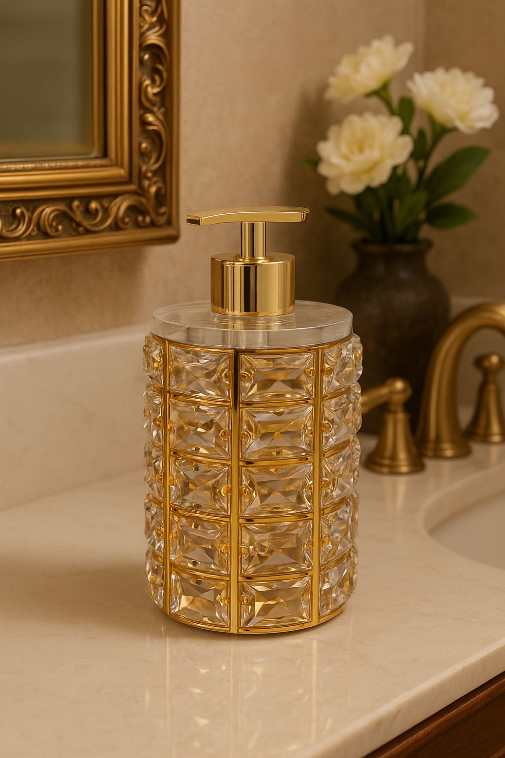 Dispenser para Sabonete Líquido com Detalhes Dourados e Acabamento em Cristal – Luxo e Sofisticação para o Seu Banheiro/lLavabo